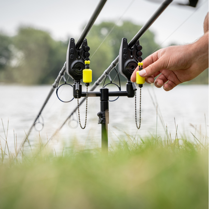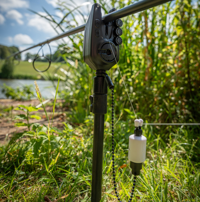 The alarm features: Soft-touch buttons control power and LED settings, with three adjustment dials for fine-tuning volume, tone, and sensitivity. Deep ears with rod-friendly rubber inlays keep rods secure and stable in all conditions. Rigid 3/8” no-twist thread with knurled locking collar and rubber washer ensures firm, anti-rotation mounting. 2.5mm Power-Out Socket with weather-sealed bung for use with illuminated swingers or bobbins.