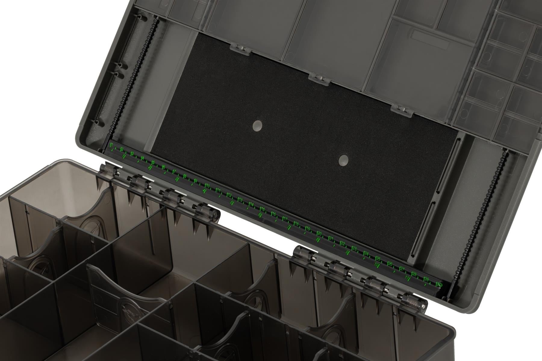 The lid also incorporates a proper rig board, just like you would find in a Rig Safe, complete with a machined, grooved hook retention bar. The Rig Board can store up to 56 pre-tied rigs and comes supplied with 30 single and 20 double pins to secure them tightly in place. The ingenuity of this tackle box doesn’t stop there, the rig board contains an innovative rig bar which will store your Spinner Booms without the need to have a hook attached. This is something that Damian Clarke devised for use within his own Rig Safe but now a similar idea has been developed for the Large Tackle Box. To finish the Rig Board off there is a hi-vis ruler to help you construct that perfect length rig or boom.