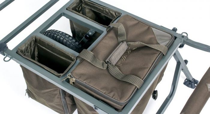 - Twin metal rimmed drop in side compartments flanking the wheels for tackle, bait and accessories with waterproof wipe clean sides